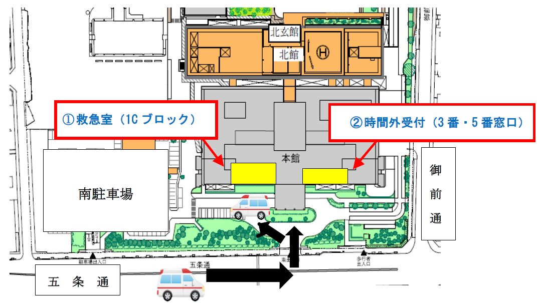 ※救急室は場所を本館に変更しておりますので、本館正面玄関からもお入りいただけます。