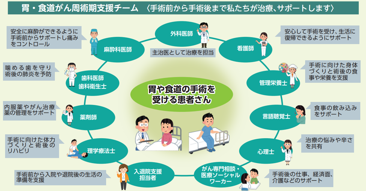 外科医師とともに、歯科医師、栄養士など専門性をもった様々な職種が協力することで、手術前から手術後まで、生活や食事に対するケアやサポートができる体制を整えています。私たちは、がんを治し、患者さんが手術後も元気に暮らし、趣味を楽しみ、お仕事に復帰できるよう、体力をなるべく落とさないことに注力しています。