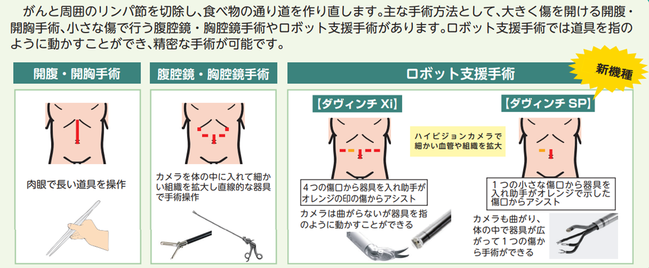 食道・胃がんに対する手術には、主に開腹手術、腹腔鏡・胸腔鏡手術、ロボット手術の3種類があります。