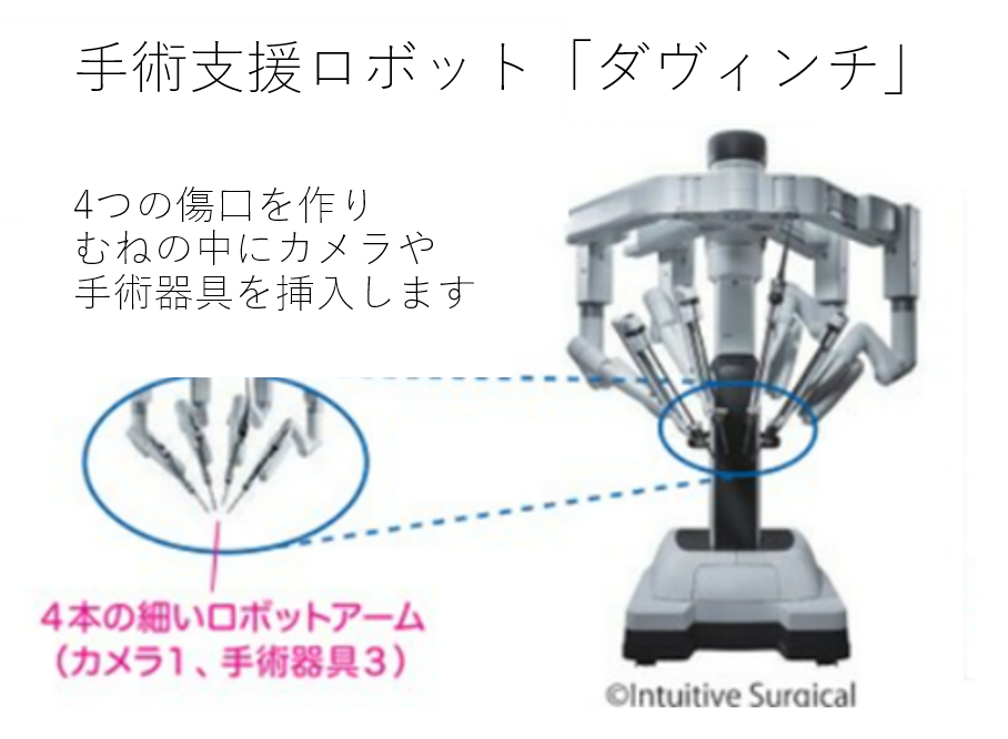 数か所の小切開からカメラと器具を挿入し、医師がロボットを操作して行う手術です。世界的に広く普及している「ダヴィンチ」は、高精細3Dカメラ・手ぶれ防止機能・人の手以上の可動域を備えており、精緻な操作が可能です。これにより、がんの根治性向上や術後の回復促進が期待できます。