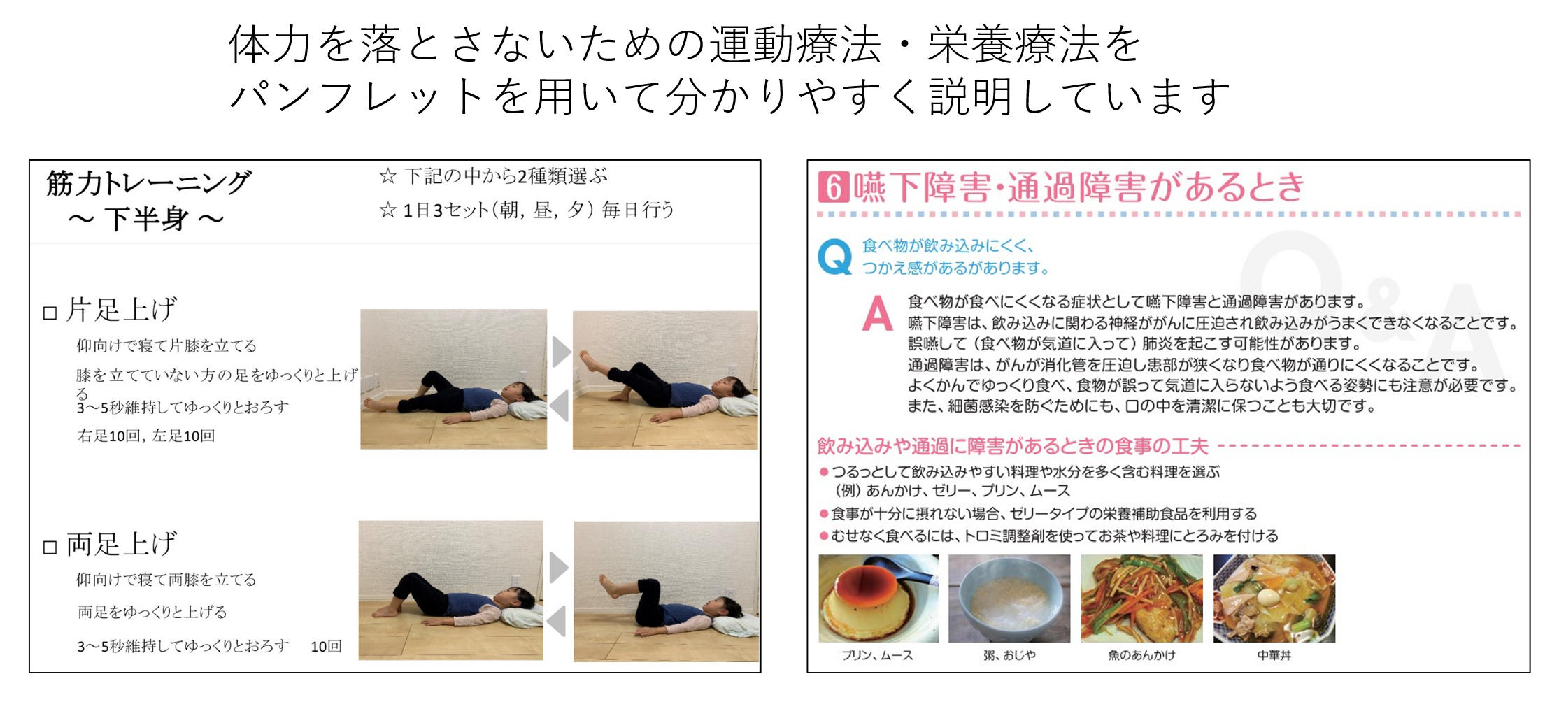 がん患者さんが少しでも食べやすいものを一緒に考え、食事をお出ししています。こうした経験から、食事への悩みを持つ患者さんやご家族に向けて、食事の工夫とレシピを集めた症状別の食事パンフレットを作成し、どなたでもご覧いただけるようホームページに掲載しています。