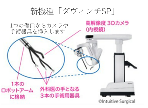 2023年に登場した「ダヴィンチSP」は、従来のように複数の傷が不要で、1か所の小さな切開からカメラと3本の器具を挿入し、体内で展開して手術を行います。