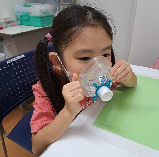 - 麻酔の時に使用するマスクを使って、吸う練習